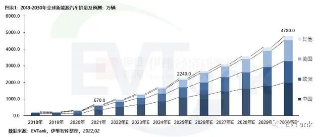 据研究机构EVTank联合伊维经济研究院共同发布的《中国新能源汽车行业发展白皮书(2022年)》数据显示:2021年,全球新能源汽车销量达到670万辆,同比大幅度增长102.4%,其中中国市场销量达到354.8万辆,同比增长160.1%。展望2030年,EVTank预计全球新能源汽车销量将达到4780万辆,占当年新车销量的比例将接近50%。