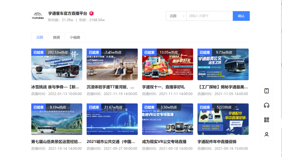 2021年,随着直播在各行各业的应用,宇通也加入了微赞直播平台,在微赞上搭建了属于自己的企业官方直播。迄今为止,该官方平台共创建直播话题30个,积累粉丝21.39w,热度累计2168.5w。