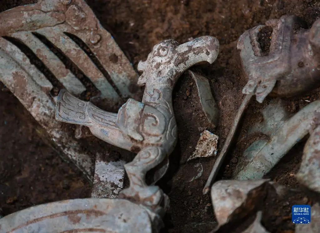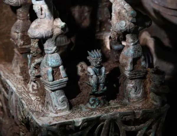 其中7号“祭祀坑”发现了被考古学家称为“月光宝盒”的龟背形网格状器,成捆的长条状玉凿、三孔玉璧形器、玉斧、玉瑗,铜顶璋龙形饰、小件的青铜凤鸟、青铜立人、铜铃等。