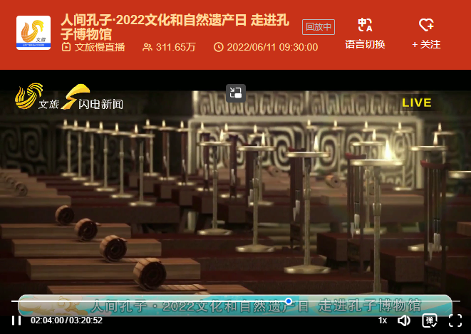 如前几天同步在文旅慢直播、人民视频、今日头条、快手、抖音、百度、哔哩哔哩等十余家网络平台的【2022文化和自然遗产日-走进孔子博物馆】直播活动,通过对孔府旧藏文物的展示,突出文物保护和研究利用成果,同时直播还充分发挥儒家文化发源地的独特优势,走进孔庙的奎文阁、大成殿、孔府等“历史现场”,全面还原了儒家思想在生活中的多维化呈现。