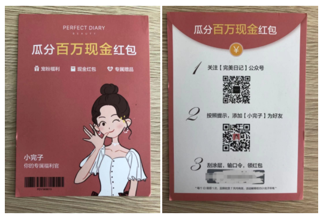 客户在电商平台中购买完美日记的产品,会随包裹附送“礼品卡片”,通过这一张小小的礼品卡片,引导客户关注完美日记的公众号,添加完美日记的个人客服为好友,最后扫码输入口令领取红包。这一套组合拳下来,完美实现了从电商平台的“公域流量”转化为微信上的“私域流量”,沉淀在完美日记的微信公众号和客服微信中,在堪称红海的美妆市场中杀出血路,成功获得客户的青睐。
