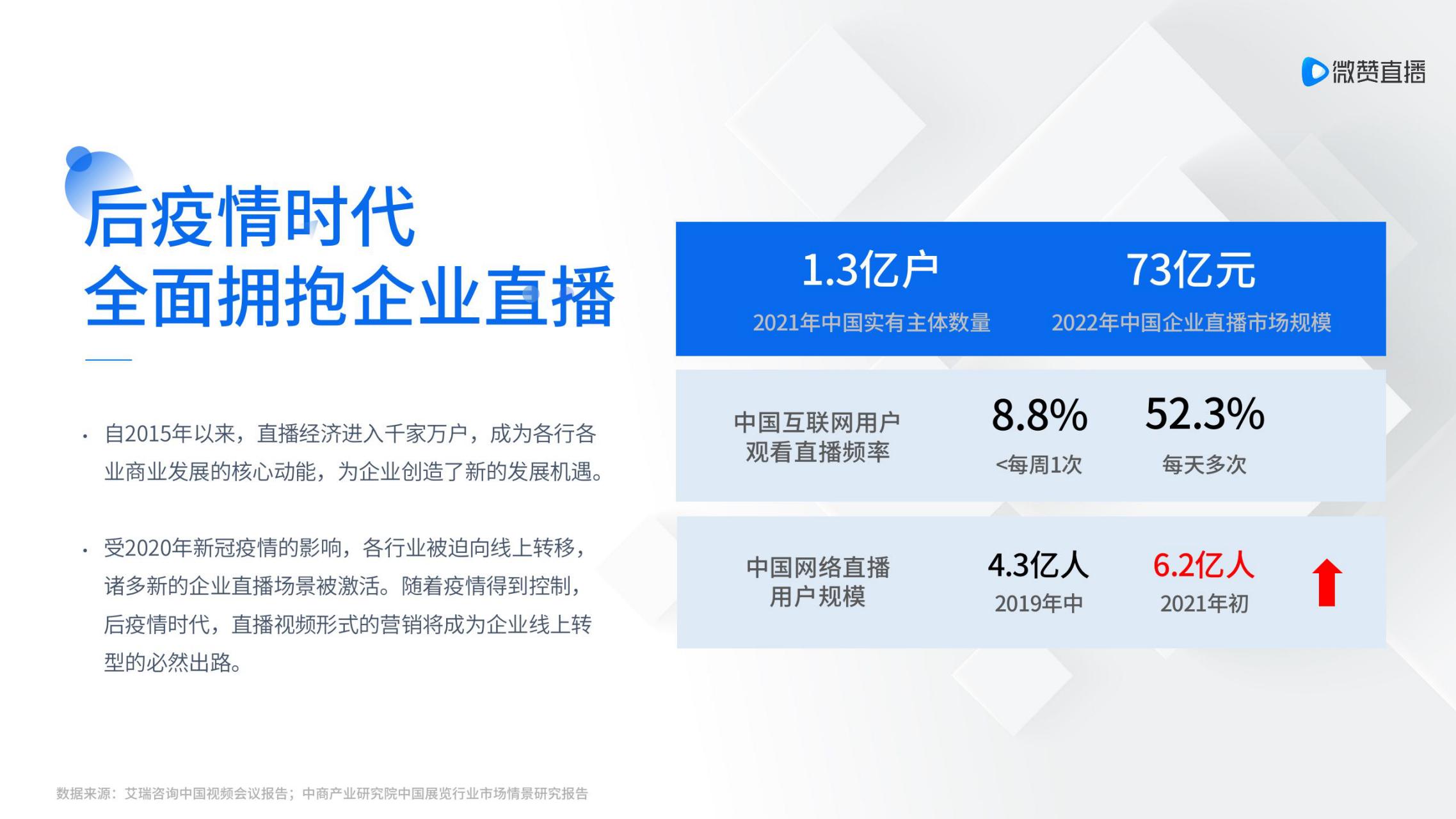 受2020年新冠疫情的影响,各行业被迫向线上转移,诸多新的企业直播场景被激活。随着疫情得到控制,后疫情时代,直播视频形式的营销将成为企业线上转型的必然出路。微赞推出企业直播2.0场景解决方案,注重在线商务社交及信息流通,打造高效率、高质量的商业互动形态,最大化凸显企业直播营销价值。