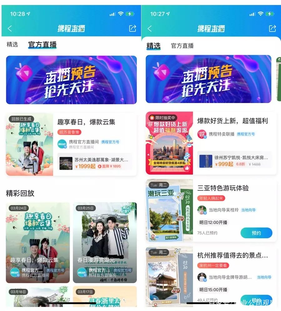 在大BOSS梁建章的带领下,越来越多的旅游商家、服务平台也竞相步入直播新领域,用直播 短视频等方式向消费者推介各种前沿旅游资源。根据媒体统计数据,在携程平台上,一共有超过3000家旅游商家入驻携程直播平台并开启了多达一万多场次的直播频次,这些商家在携程平台直播期间直接产生的订单数,更是较之之前提升了近15倍规模。