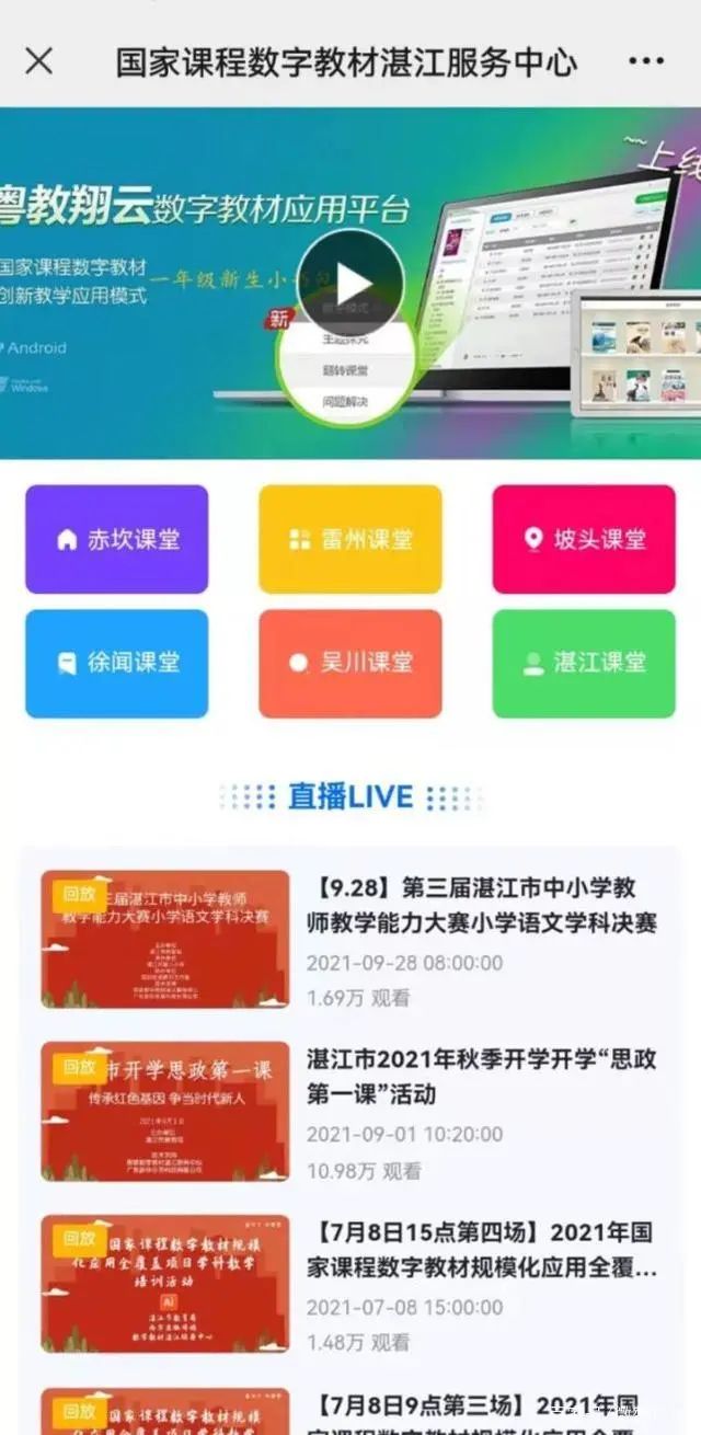 以国家课程数字教材湛江服务中心搭建的品牌微官网为例,作为广东省国家课程数字教材规模化应用的覆盖试点,湛江市教育局和国家课程数字教材湛江服务中心通过直播开展教育信息化的教师专题培训,加强县市区教育机关与学校之间的联动,促进信息技术与教育教学点深度融合,加快推动数字教材的落地。