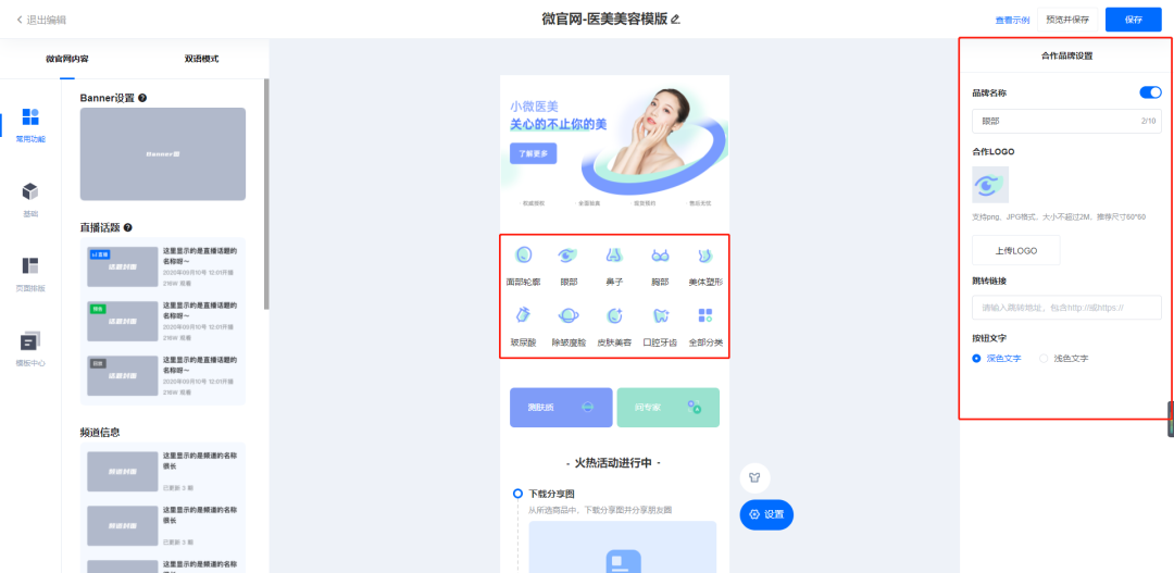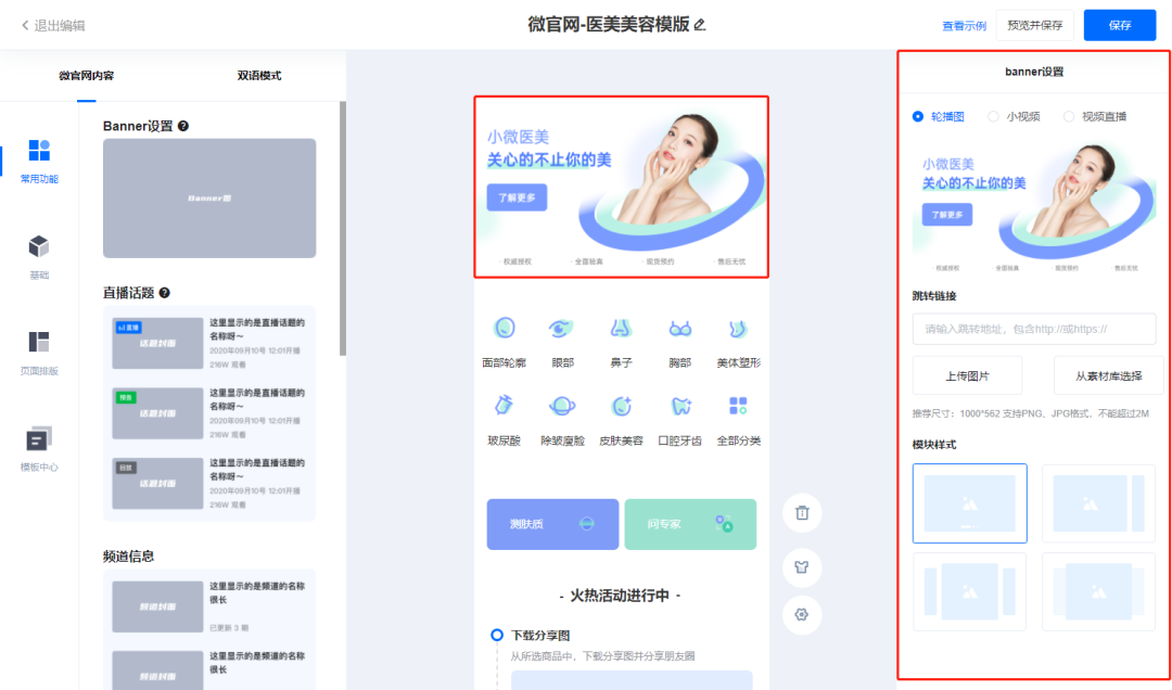 比如,我们可以选择【微官网-医美美容模板】来进行搭建,进入编辑模式后,点击模板中的banner,就可以进行编辑与修改。除了图片形式之外,微赞还支持上传短视频和直播话题,同时支持图片链接跳转,实现站外信息的补充。