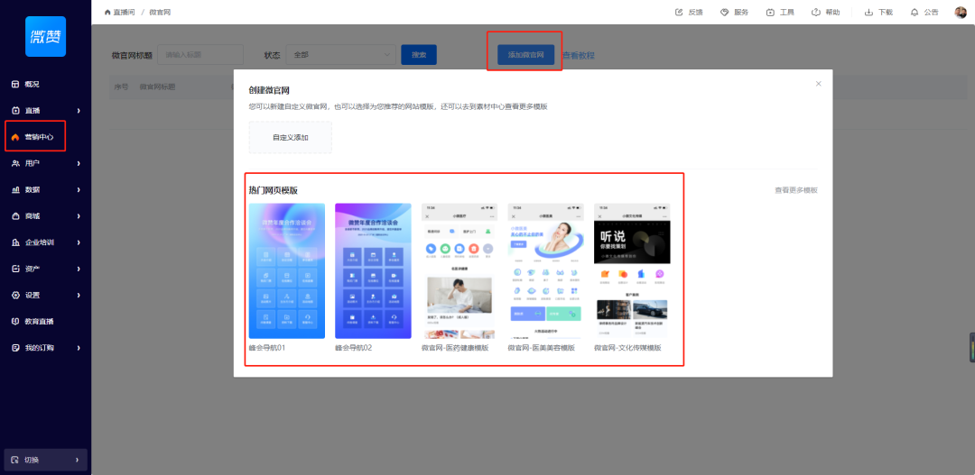 用户可以选择【自定义添加】,根据自己想要实现的效果来搭建品牌微官网,也可以使用热门的网页模板,修改模板中的内容,来完成自己的微官网。