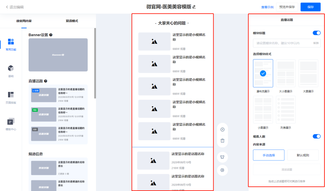 用户案例则是品牌微官网中最常见的直播话题呈现,用户可以选择直播话题的呈现方式,还能手动添加直播话题,简单快捷。